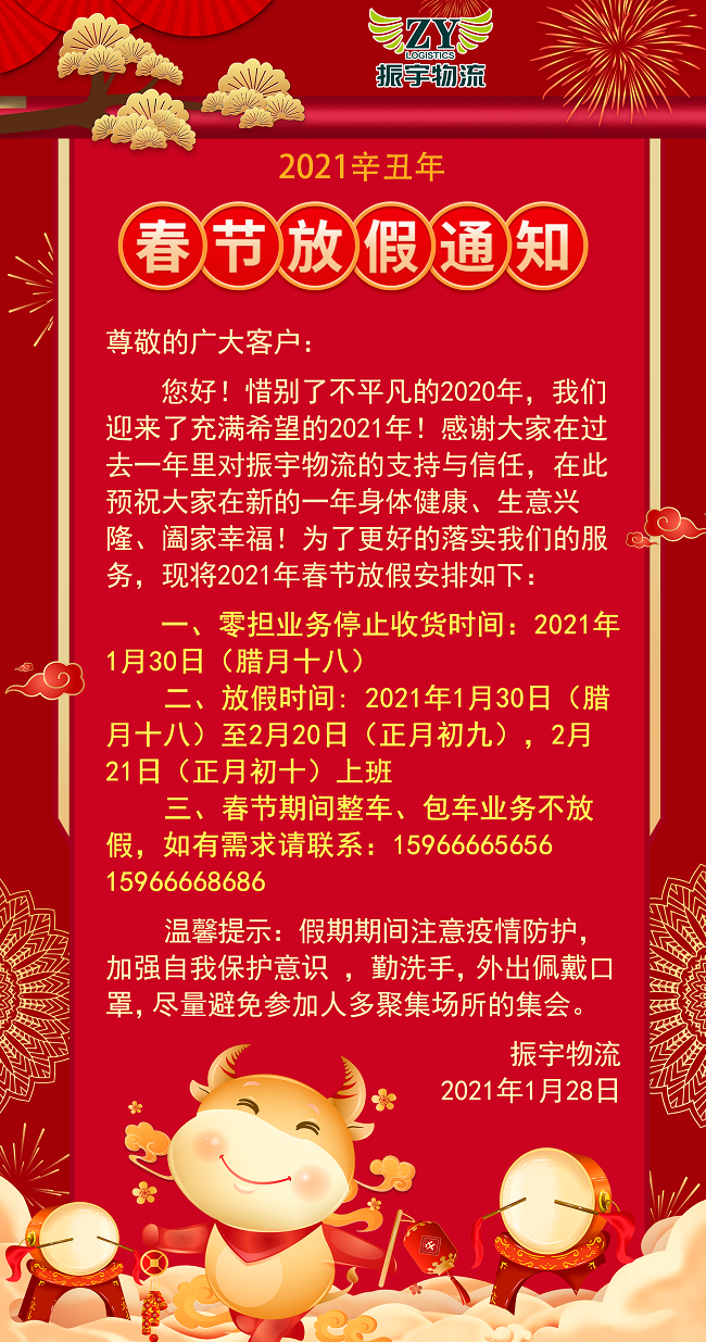 您好!惜別了不平凡的2020年,我們迎來了充滿希望的2021年!感謝大家在過去一年里對振宇物流的支持與信任,在此預祝大家在新的一年身體健康、生意興隆、闔家幸福!為了更好的落實我們的服務,現將2021年春節放假安排如下: