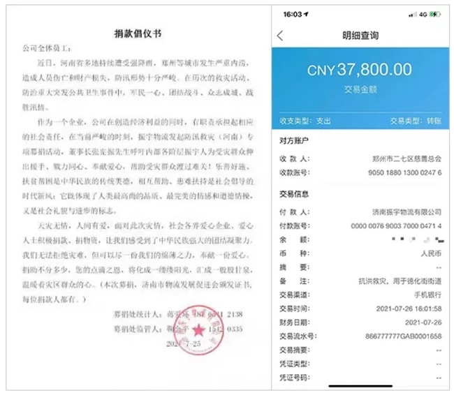 在當前嚴峻的時刻,振宇物流發起防汛救災(河南)專項募捐活動,董事長張憲振先生呼吁振宇人為受災群眾伸出援手、戮力同心、奉獻愛心,幫助受災群眾渡過難關!大家慷慨解囊、踴躍捐款,7月25日、26日兩天時間匯集捐款37800元。