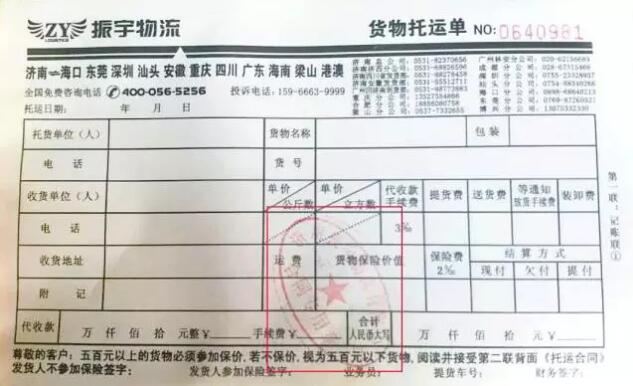 1、我公司發貨都有統一的發貨單,并印有振宇物流公司的公章。