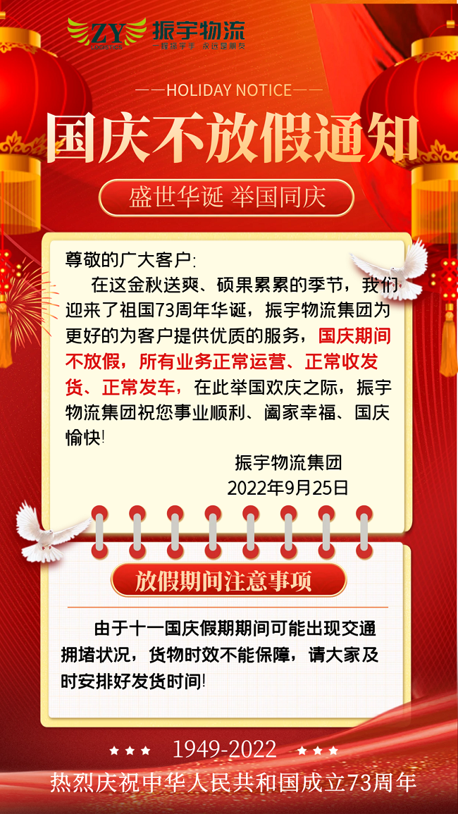 在這金秋送爽、碩果累累的季節(jié),我們迎來了祖國73周年華誕,振宇物流集團(tuán)為更好的為客戶提供優(yōu)質(zhì)的服務(wù),國慶期間不放假,所有業(yè)務(wù)正常運(yùn)營、正常收發(fā)貨、正常發(fā)車,在此舉國歡慶之際,振宇物流集團(tuán)祝您事業(yè)順利、闔家幸福、國慶愉快!
