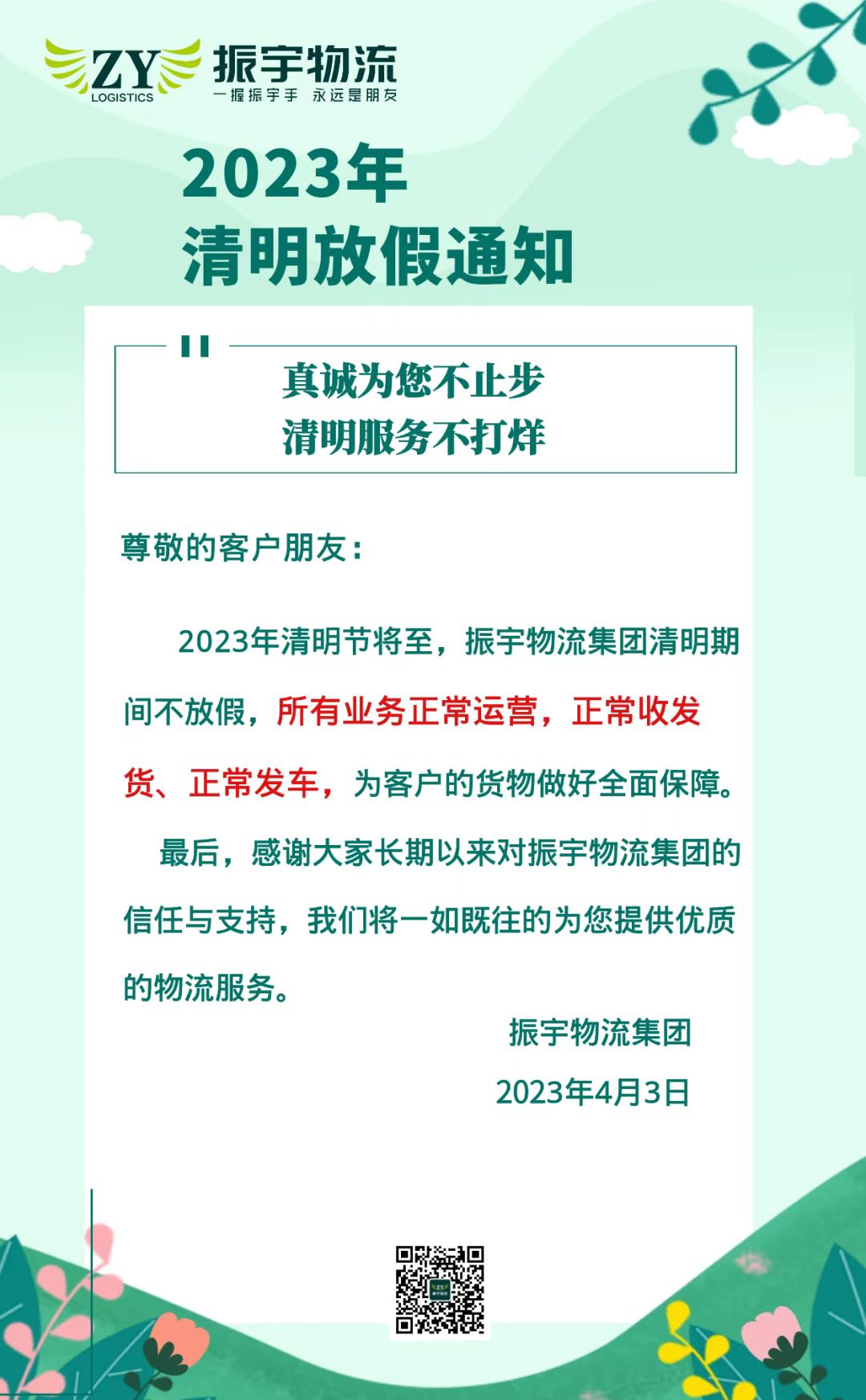 2023年清明節將至,振宇物流集團清明期間不放假,所有業務正常運營,正常收發貨、正常發車,為客戶的貨物做好全面保障。最后,感謝大家長期以來對振宇物流集團的信任與支持,在此祝您度過一個愉快的假期。