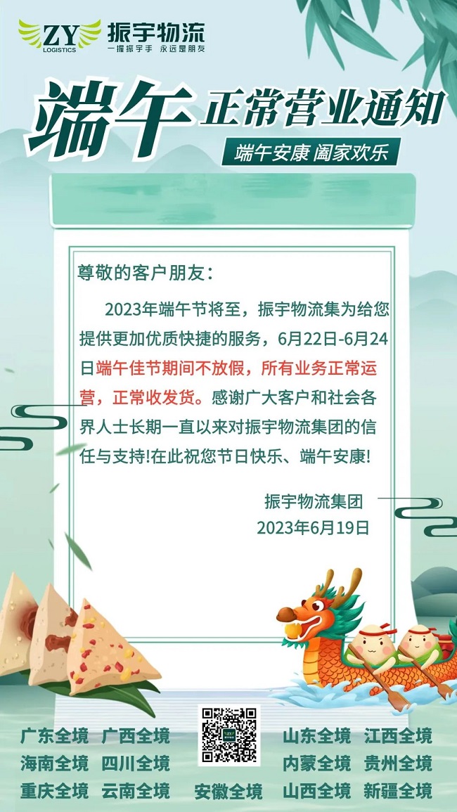 2023年端午節將至,振宇物流集為給您提供更加優質快捷的服務,6月22日-6月24日端午佳節期間不放假,所有業務正常運營,正常收發貨。感謝廣大客戶和社會各界人士長期一直以來對振宇物流集團的信任與支持!在此祝您節日快樂、端午安康!