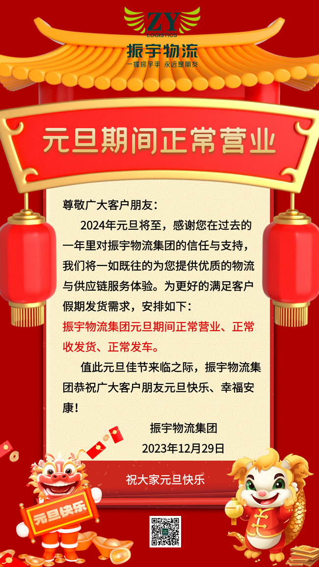 2024年元旦將至,感謝您在過去的一年里對振宇物流集團的信任與支持,我們將一如既往的為您提供優質的物流與供應鏈服務體驗。為更好的滿足客戶假期發貨需求,安排如下: