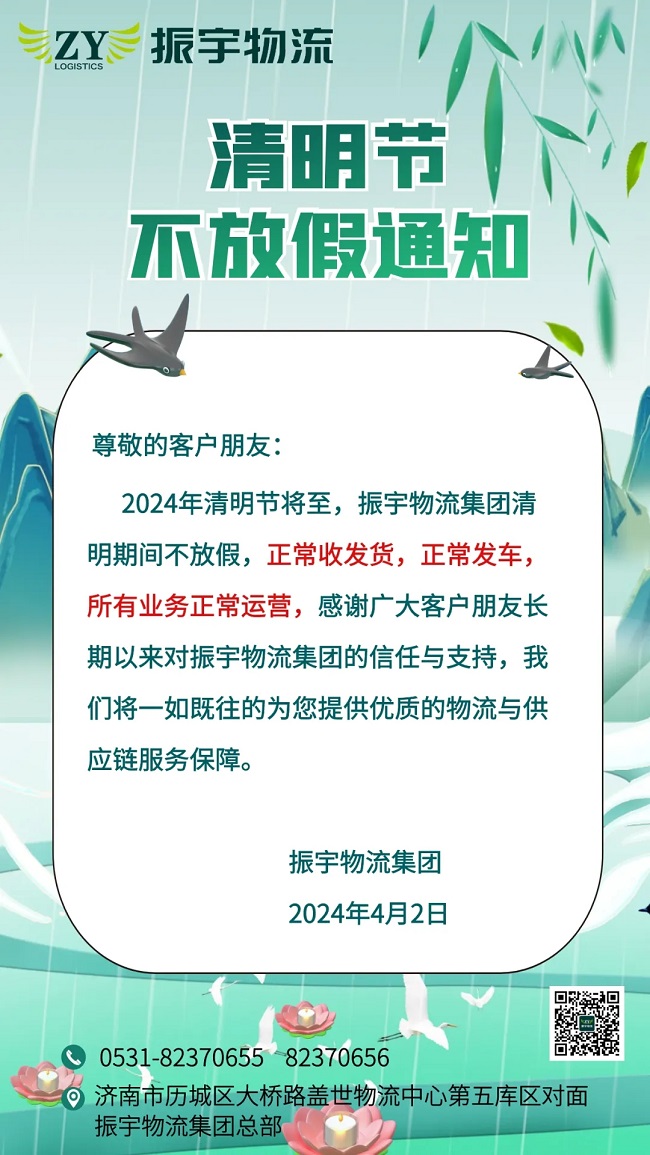 2024年清明節(jié)將至,振宇物流集團(tuán)清明期間不放假,正常收發(fā)貨,正常發(fā)車,所有業(yè)務(wù)正常運(yùn)營,感謝廣大客戶朋友長期以來對振宇物流集團(tuán)的信任與支持,我們將一如既往的為您提供優(yōu)質(zhì)的物流與供應(yīng)鏈服務(wù)保障。