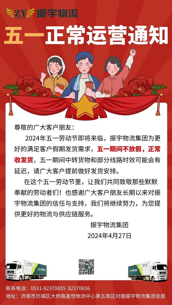 2024年五一勞動節即將來臨,振宇物流集團為更好的滿足客戶假期發貨需求,五一期間不放假,正常收發貨,五一期間中轉貨物和部分線路時效可能會有延遲,請廣大客戶提前做好發貨安排。