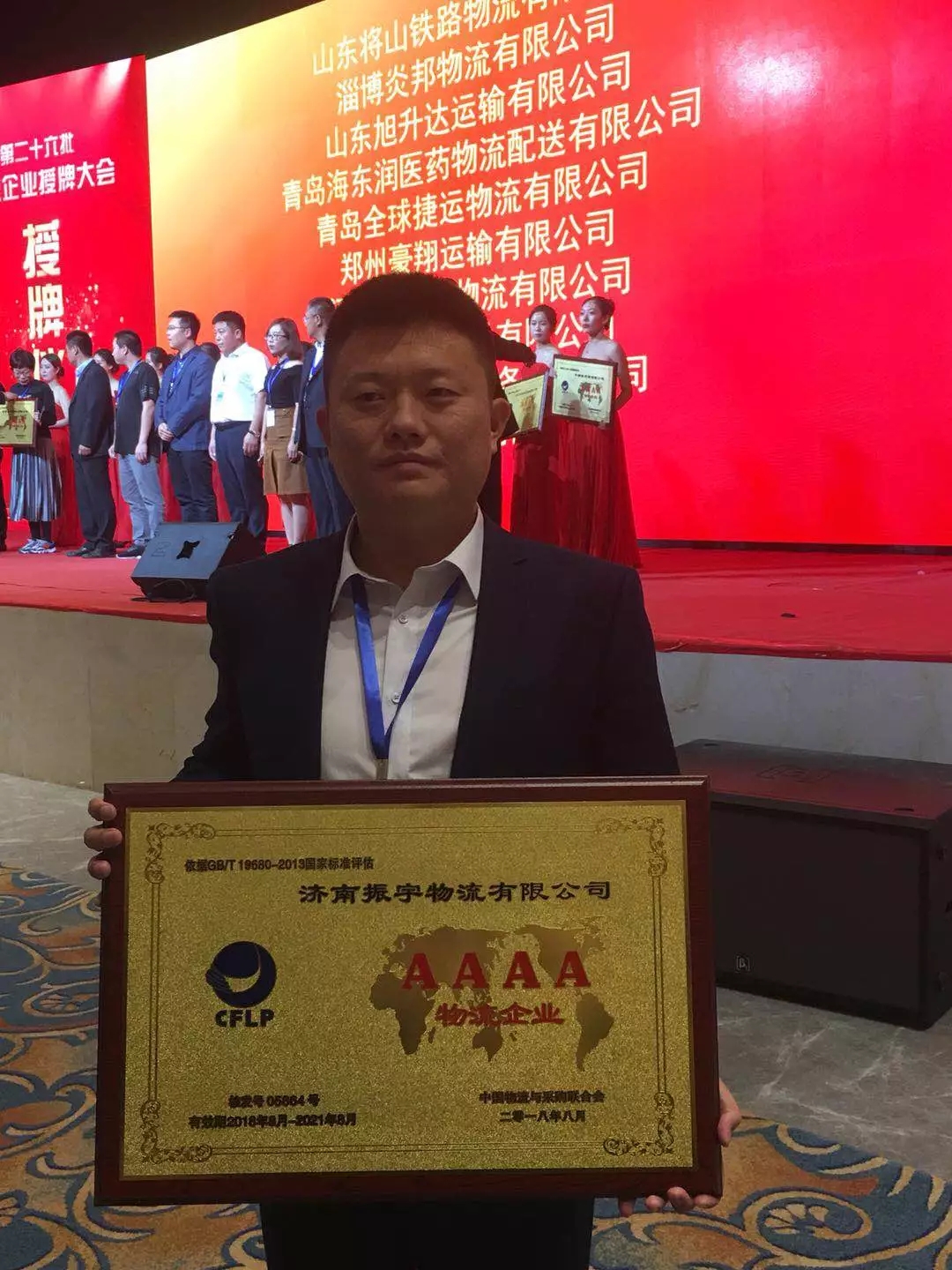 發布者:振宇物流 發布時間:2018-09-17 15:47:49        2018年9月16日,由中國物流與采購聯合會主辦的A級物流企業授牌大會暨物流業創新發展論壇在吉林省長春市隆重舉行。會議對本批A級物流企業進行了集中授牌,濟南振宇物流有限公司榮獲國家AAAA級物流企業,總經理張憲振代表公司出席會議并接受授牌。